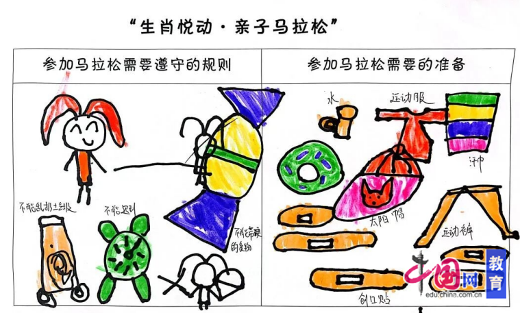 除了对路程的神往,孩子们还仔细讨论起马拉松的规矩。煜煜仔细地说:“参加马拉松必定不可以迟到。”文文交心提示:“奔驰的时分要注意和伙伴坚持安全间隔。”轩轩弥补道:“有必要和家长一起跑,不能自己跑去河边玩。”关于参赛所需的预备物品,孩子们也逐个画在纸上、记在心里。创可贴、消毒棉签、冰敷袋、隔汗巾……每相同物品都是看护健康的“小卫兵”。